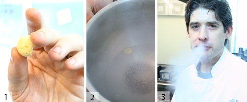 液氮冰淇淋的冰淇淋基料和液氮大約相等。1)您將看不到任何東西。2)成品。